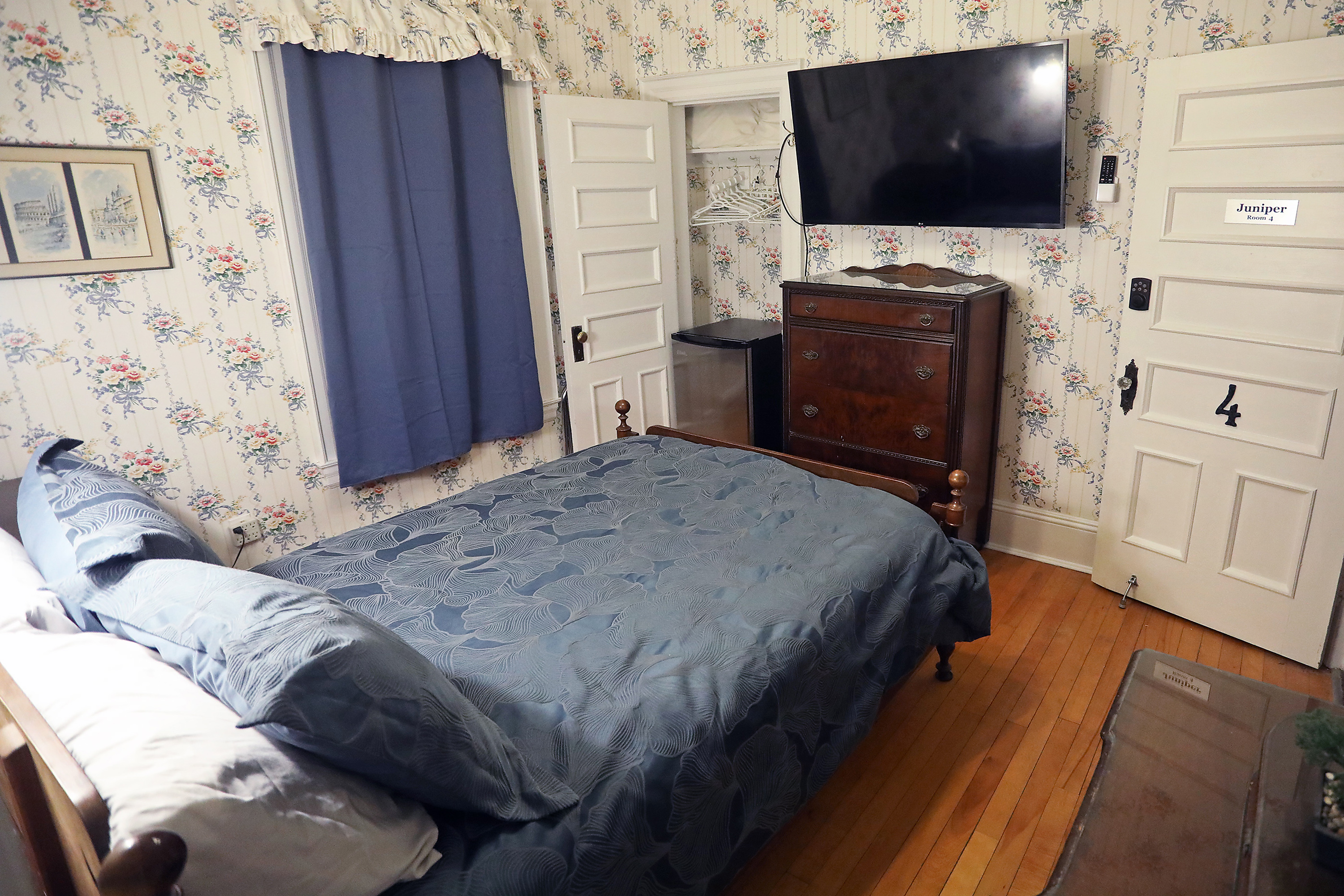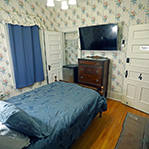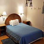 Blue theme, corner room, queen bed, fridge & television, attached bath with stand-up shower.