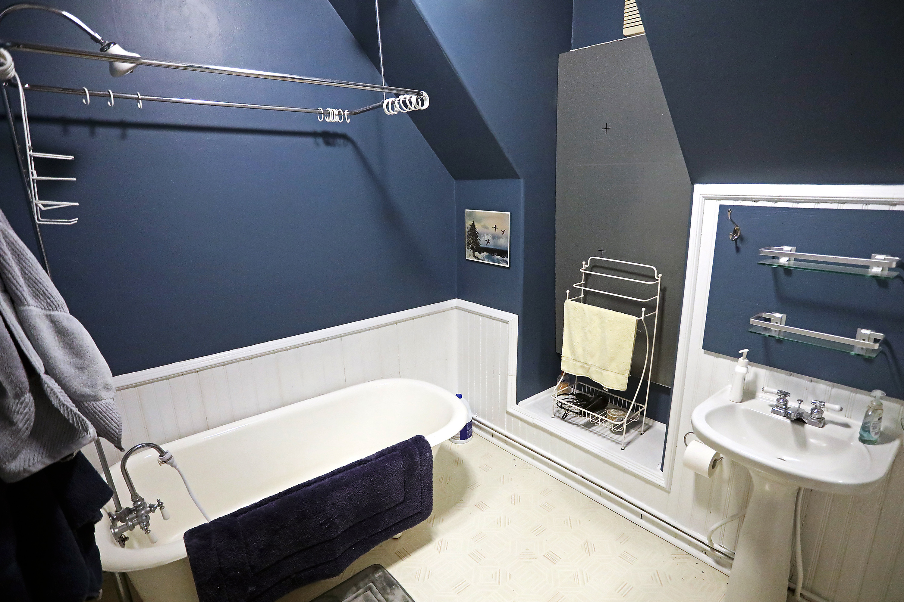 Juniper is a 10' by 11' room with one Full bed. The attached private bathroom has a claw-foot tub with attached shower. This room features a 51-inch large-screen television, plus a small refrigerator. This room also features a multi-device charging station.